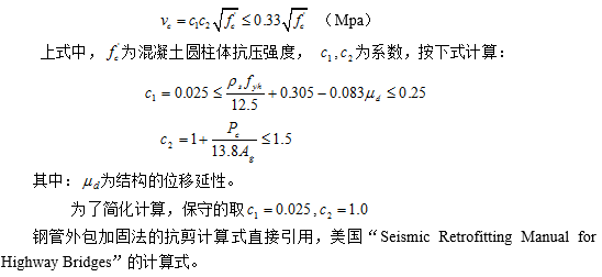 15.3.10 地震中大量鋼筋混凝土墩柱的剪切破壞表明:在墩柱塑性鉸區(qū)域由于彎曲延性增加會使混凝土所提供的抗剪強度降低。為此,各國對墩柱塑性鉸區(qū)域的抗剪強度進行了許多研究,ACI-319-89 要求在端部塑性鉸區(qū)域當軸壓比小于0.05時,不考慮混凝土的抗剪能力,新西蘭規(guī)范NZS-3101中規(guī)定當軸壓比小于0.1時,不考慮混凝土的抗剪能力。而我國《公路工程抗震設計規(guī)范》沒有對地震荷載作用下的鋼筋混凝土墩柱抗剪設計作出特別的規(guī)定,工程設計中缺乏有效的依據(jù),只能套用普通設計中采用的斜截面強度設計公式來進行設計和校核,存在較大缺陷。因此,對增大截面法加固的橋墩,采用《美國加州抗震設計準則》的抗剪計算公式,但對其混凝土提供抗剪能力計算公式進行了簡化,具體如下。