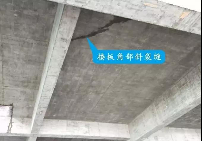 表現(xiàn)形式:現(xiàn)澆樓板角部產生斜裂縫。