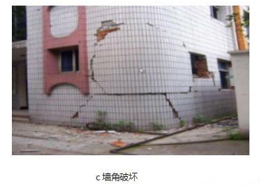 在房屋端部四角處,由于剛度較大以及地震時的扭轉(zhuǎn)作用,易產(chǎn)生應(yīng)力集中,且墻角整體約束作用較弱故而易遭破壞,甚至引起轉(zhuǎn)角墻局部倒塌。