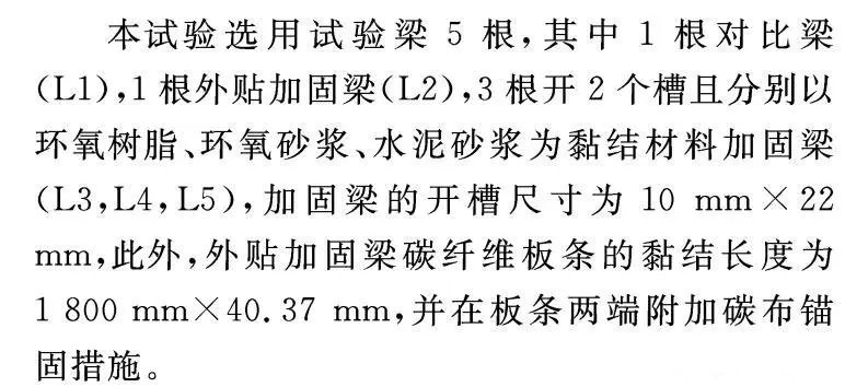 擬對(duì)5根試驗(yàn)梁進(jìn)行抗彎靜載試驗(yàn),1根對(duì)比梁L1、1根外貼碳板加固梁L2、3根內(nèi)嵌不同黏結(jié)材料的碳板加固梁(環(huán)氧樹脂結(jié)構(gòu)膠L3、環(huán)氧砂漿L4、水泥砂漿L5)對(duì)加固梁的破壞形態(tài)、剛度、荷載-應(yīng)變、極限承載力、裂縫等進(jìn)行分析。