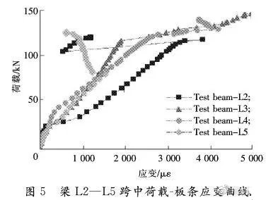 從加固梁跨中碳板荷載-應(yīng)變關(guān)系曲線看出,在開裂荷載后,外貼梁L2與內(nèi)嵌梁的應(yīng)變差很大,即碳板承擔(dān)的力相差很大。由于外貼梁發(fā)生剝離破壞,碳板退出工作。內(nèi)嵌加固梁則呈現(xiàn)一定的塑性。