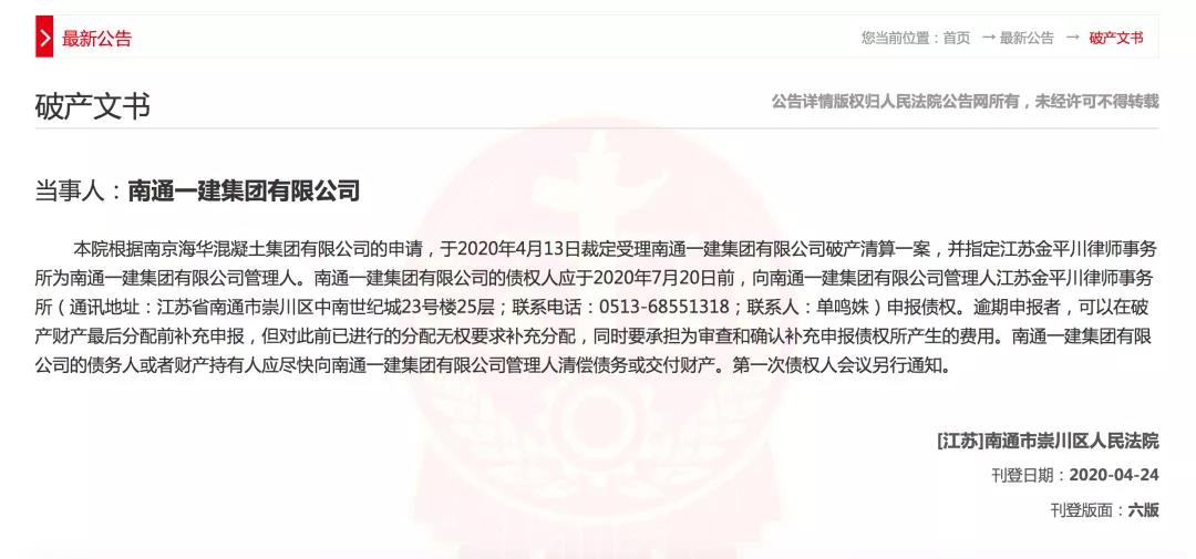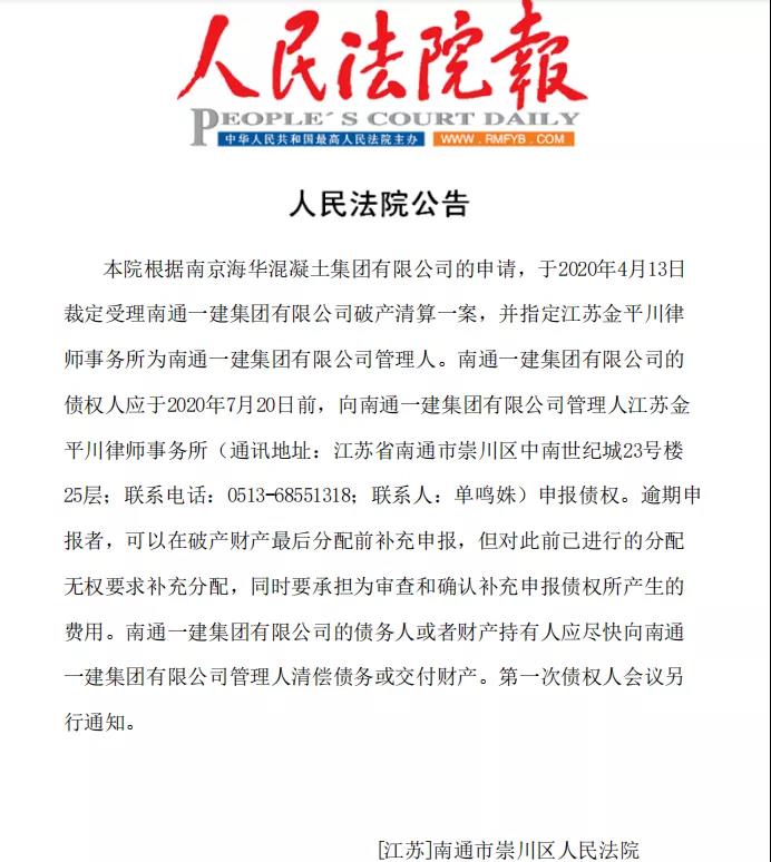 據人民法院公告顯示,江蘇省崇川區(qū)人民法院根據南京海華混凝土集團有限公司的申請,于2020年4月13日裁定受理南通一建集團有限公司破產清算一案,并指定江蘇金平川律師事務所為南通一建集團有限公司管理人。