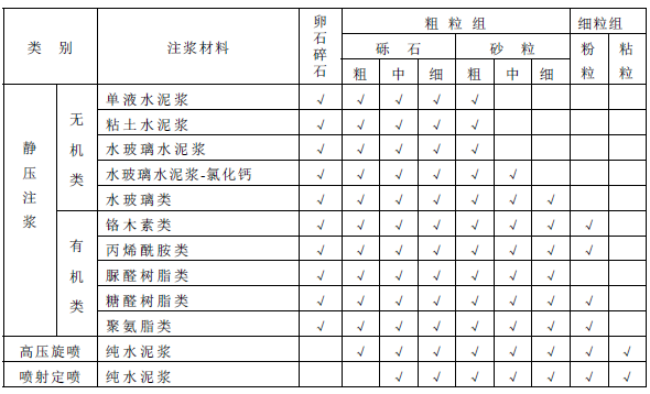 噴射時不同漿液材料的地質適用范圍如表9-4-1 所示。