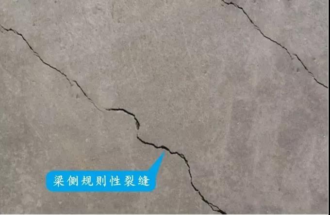表現(xiàn)形式:現(xiàn)澆樓板上表面在梁兩側出現(xiàn)規(guī)則性裂縫。