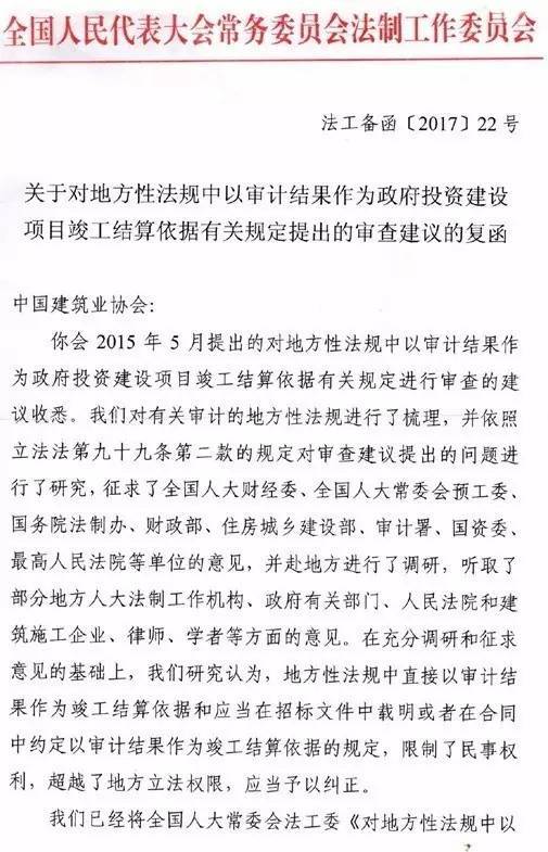法工委復(fù)函《關(guān)于對地方性法規(guī)中以審計結(jié)果作為政府投資建設(shè)項目竣工結(jié)算依據(jù)有關(guān)規(guī)定提出的審查建議的復(fù)函》。該復(fù)函提出,經(jīng)過充分調(diào)研和征求意見,認(rèn)為地方性法規(guī)中直接以審計結(jié)果作為竣工結(jié)算依據(jù)和應(yīng)當(dāng)在招標(biāo)文件中載明或者在合同中約定以審計結(jié)果作為竣工結(jié)算依據(jù)的規(guī)定,限制了民事權(quán)利,超越了地方立法權(quán)限,應(yīng)當(dāng)予以糾正。