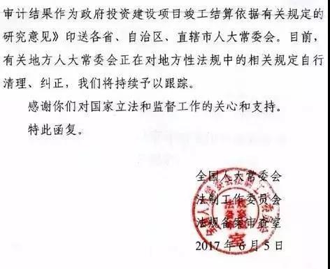 法工委印發(fā)《對地方性法規(guī)中以審計結(jié)果作為政府投資建設(shè)項目竣工結(jié)算依據(jù)有關(guān)規(guī)定的研究意見》,要求各省、自治區(qū)、直轄市人大常委會對所制定或者批準(zhǔn)的與審計相關(guān)的地方性法規(guī)開展自查,對有關(guān)條款進(jìn)行清理糾正。
