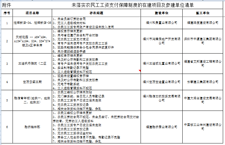 福州市城鄉(xiāng)建設(shè)局關(guān)于房屋建筑和市政基礎(chǔ)設(shè)施工程領(lǐng)域在建項目未按規(guī)定落實農(nóng)民工工資支付保障制度的通報