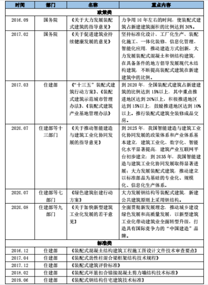 2016年是裝配式建筑的政策元年,《關(guān)于大力發(fā)展裝配式建筑的指導(dǎo)意見》正式發(fā)布,明確提出“力爭用10年左右的時(shí)間,使裝配式建筑占新建建筑面積的比例達(dá)到30%”這一具體目標(biāo),之后,相關(guān)部門陸續(xù)出臺了一系列政策和標(biāo)準(zhǔn)類文件。