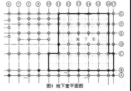 貴州巖溶地區(qū)某建筑物位于斜坡地帶,建筑物長93m,寬36m,地上3層,地下l層(-4.8m架空停車場),局部地下室,地下室長38.8m,寬36m,獨(dú)立柱基礎(chǔ),單柱最大荷重3800kN,地基持力層為中風(fēng)化泥質(zhì)白云巖,Ⅱ類建筑場地。后設(shè)計(jì)改地下室為地下設(shè)備試驗(yàn)室,設(shè)計(jì)地坪標(biāo)高1112.000m,地下室底板標(biāo)高為1107.200m,框架結(jié)構(gòu)。該工程于2009年12月完成巖土工程勘察,2011年3月開始基礎(chǔ)施工和基坑開挖,在2011年6月4~8連續(xù)強(qiáng)降雨,大量的地表水漫流灌入地下室場地內(nèi),基坑大量積水,造成地下室底板上浮,導(dǎo)致局部結(jié)構(gòu)梁拉裂,11軸交G軸上浮高達(dá)68mm,16~17軸交G軸上浮高達(dá)48mm,15~16交B~C軸因?yàn)殡娞菥瓷细?見圖1)。此時(shí)該工程才完成地基基礎(chǔ)施工和地下室頂板(1層樓面)施工,基坑還未回填。